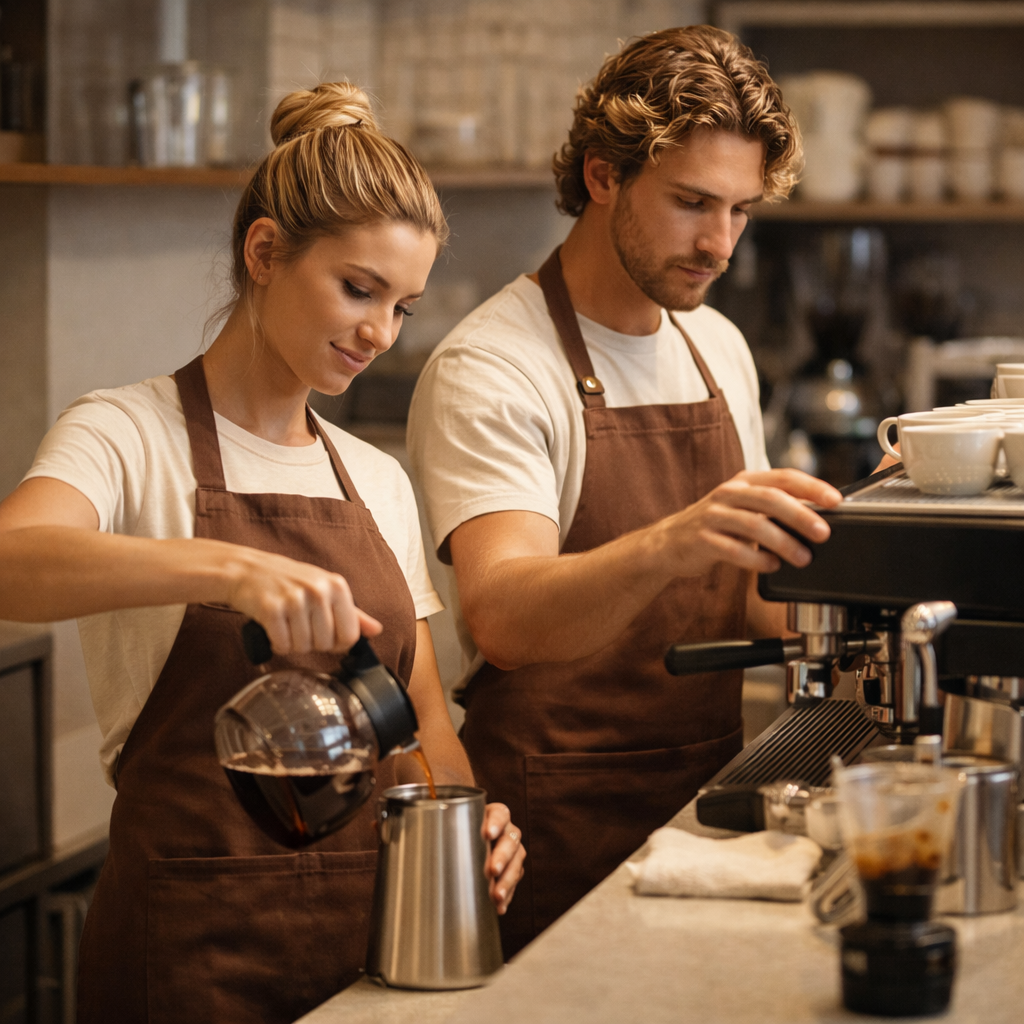 Trendy hospitality aprons for chefs, servers, and kitchen staff. Stylish, durable workwear aprons with custom embroidery for restaurants, hotels, cafés, and hospitality venues.