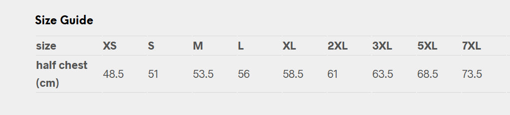 | half chest (cm) | 48.5 | 51 | 53.5 | 56 | 58.5 | 61 | 63.5 | 68.5 | 73.5 |