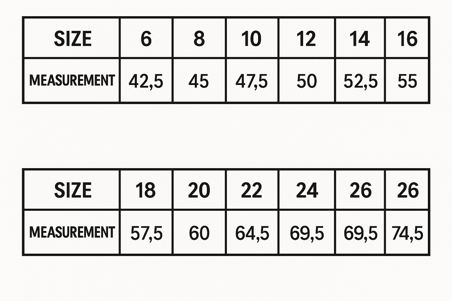 Product Size Chart