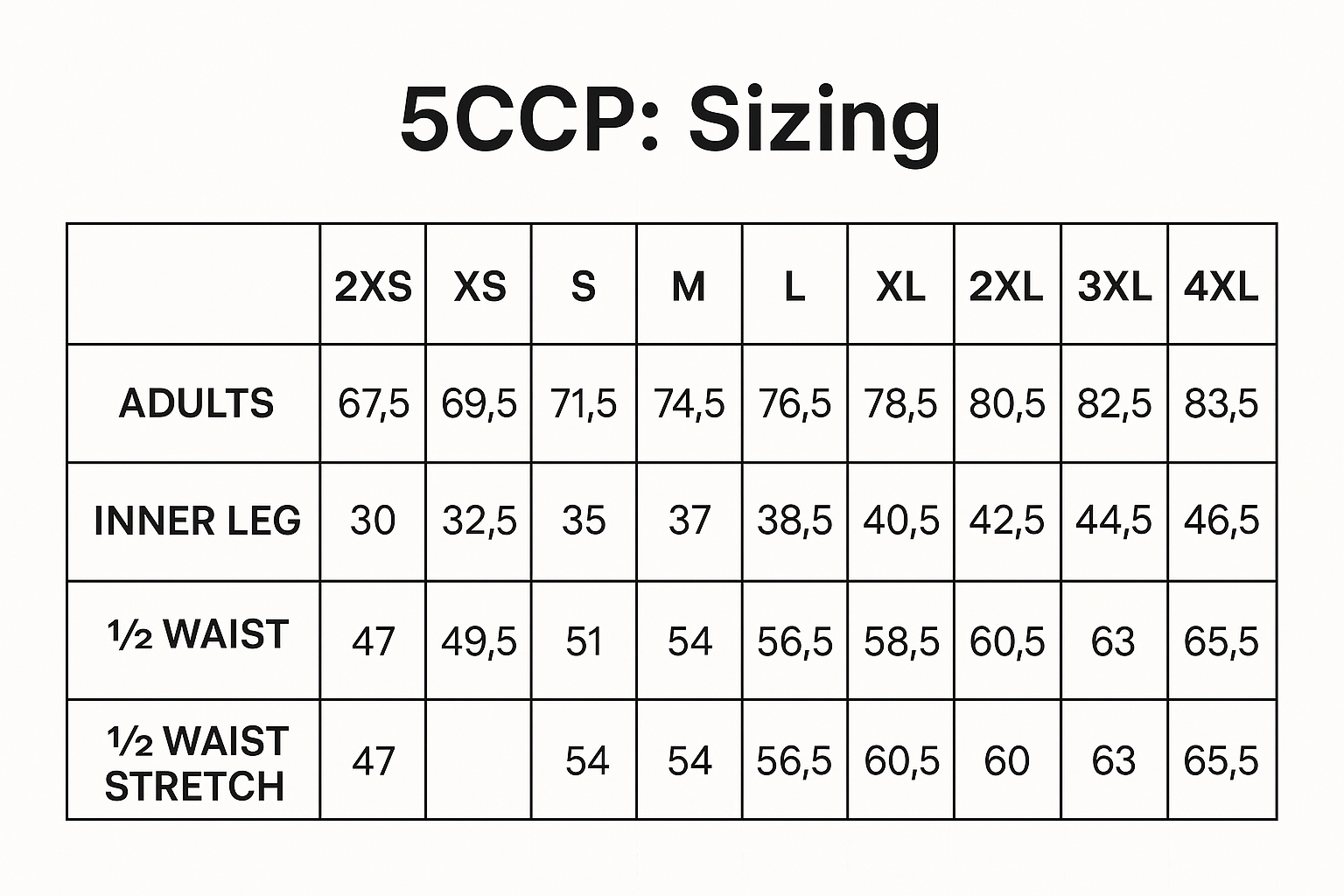 ADULTS 2XS XS S M L XL 2XL 3XL 4XL 1/2 WAIST 30 32.5 35 37 38.5 40.5 42.5 44.5 46.5 1/2 WAIST STRETCH 47 49.5 51 54 56.5 58.5 60.5 63 65.5 INNER LEG 67.5 69.5 71.5 74.5 76.5 78.5 80.5 82.5 83.5
