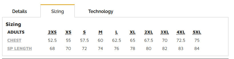 | Chest | 52.5 | 55 | 57.5 | 60 | 62.5 | 65 | 67.5 | 70 | 72.5 | 75 |