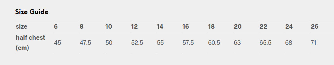 Sizes: 8–22 (Half chest 47–64.5 cm)