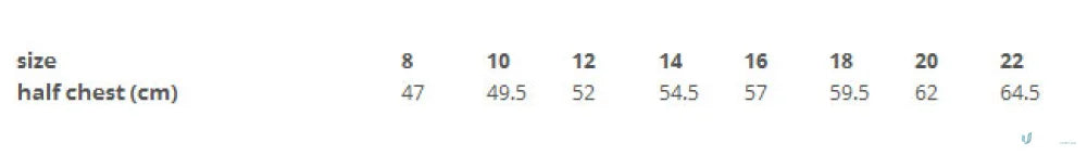 Sizes: 8–22 (Half chest 47–64.5 cm)