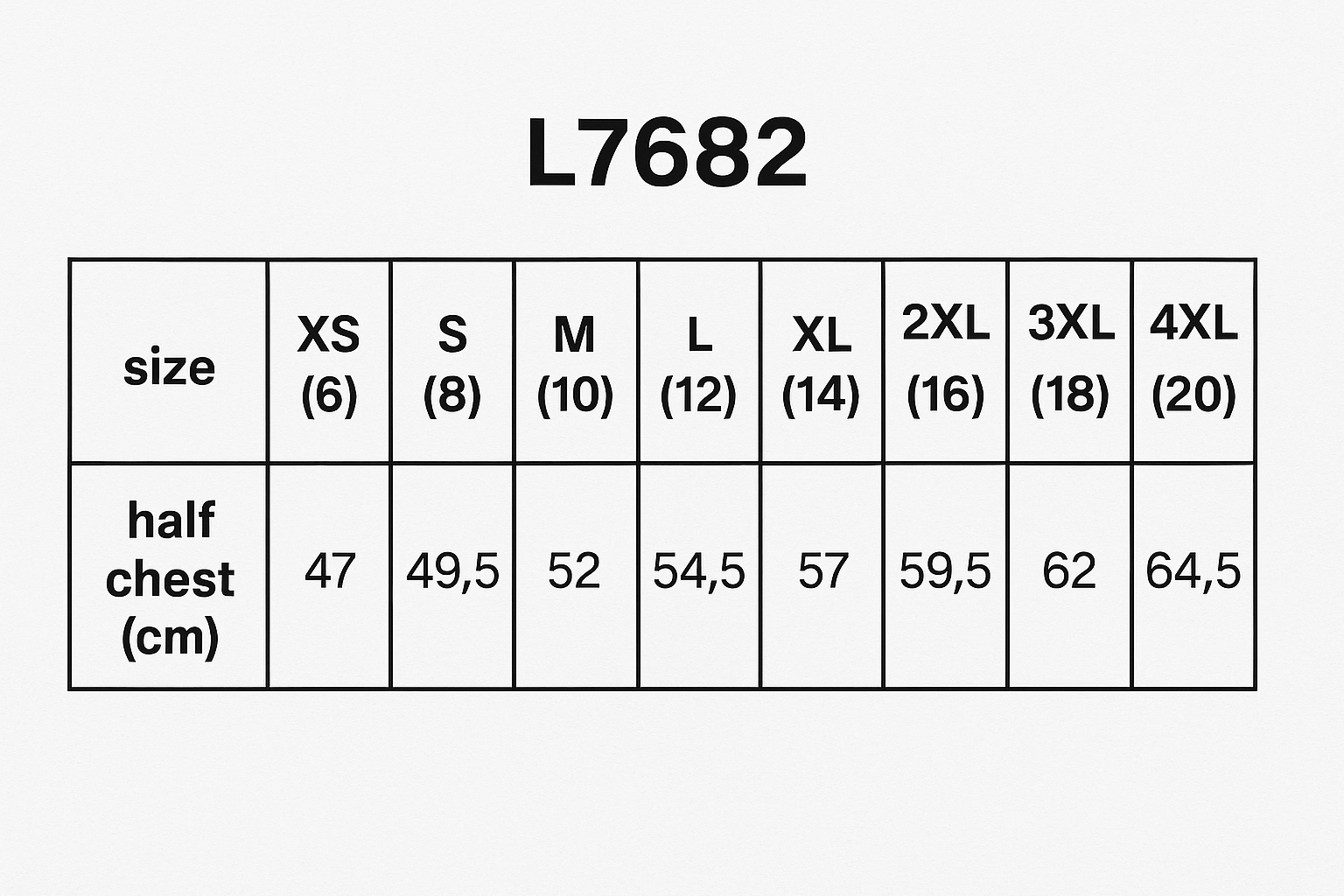 | half chest (cm) | 47 | 49.5 | 52 | 54.5 | 57 | 59.5 | 62 | 64.5 |