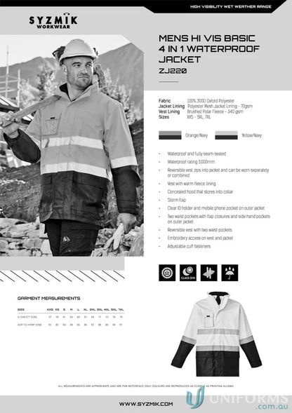 Stay Visible and Protected with the Syzmik Men's Hi Vis Basic 4-in-1 Waterproof Jacket ZJ220