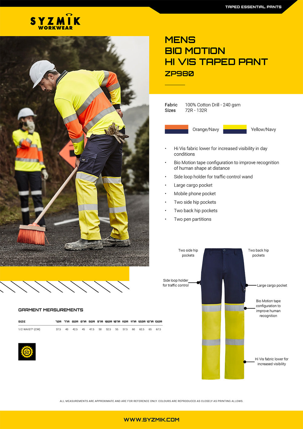 The Syzmik Men’s Bio Motion Hi Vis Taped Pant ZP980 combines comfort and functionality, making it the perfect choice for those who work in high-risk or high-visibility environments.