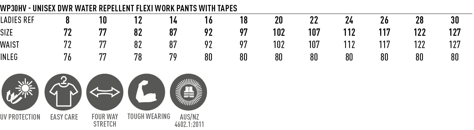 Ideal for tradies, construction workers, landscapers, warehouse crews, mechanics, and anyone who needs reliable, comfortable workwear that can handle anything. Whether you're battling the elements or just need tough, comfortable work pants that move with you, the WP30 Flexi Work Pants have got you covered.