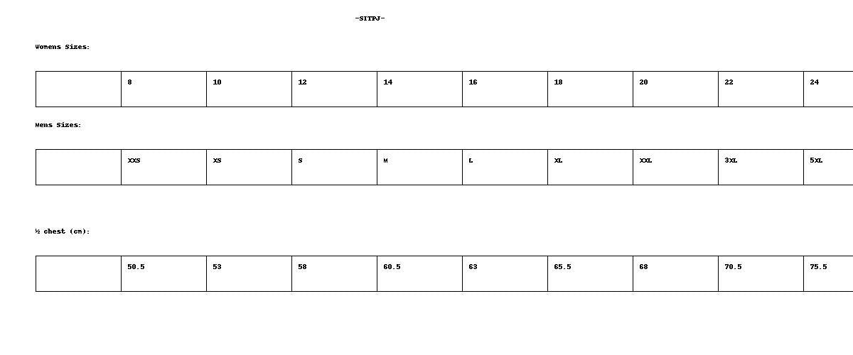 | Womens Sizes: | 8 | 10 | 12 | 14 | 16 | 18 | 20 | 22 | 24 | Mens Sizes: | XXS | XS | S | M | L | XL | XXL | 3XL | 5XL | ½ chest (cm): | 50.5 | 53 | 58 | 60.5 | 63 | 65.5 | 68 | 70.5 | 75.5 |